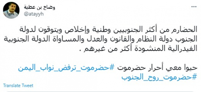 وقال في تغريدة عبر "تويتر" رصدها "المشهد العربي": "الحضارم من أكثر الجنوبيين وطنية وإخلاص ويتوقون لدولة الجنوب دولة النظام والقانون والعدل والمساواة، الدولة الجنوبية الفيدرالية المنشودة أكثر من غيرهم".