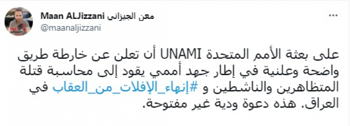 وقال في تغريدة عبر "تويتر" رصدها "المشهد العربي": "على بعثة الأمم المتحدة UNAMI أن تعلن عن خارطة طريق واضحة وعلنية في إطار جهد أممي يقود إلى محاسبة قتلة المتظاهرين والناشطين وإنهاء الإفلات من العقاب في العراق. هذه دعوة ودية غير مفتوحة".