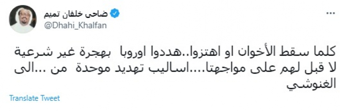 وقال في تغريدة عبر "تويتر" رصدها "المشهد العربي": "كلما سقط الإخوان أو اهتزوا.. هددوا أوروبا بهجرة غير شرعية لا قبل لهم على مواجهتها.... أساليب تهديد موحدة من ... إلى الغنوشي".