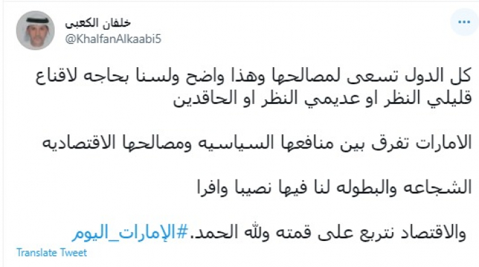 وقال في تغريدة عبر "تويتر" رصدها "المشهد العربي": "كل الدول تسعى لمصالحها وهذا واضح ولسنا بحاجه لإقناع قليلي النظر أو عديمي النظر أو الحاقدين.. الإمارات تفرق بين منافعها السياسية ومصالحها الاقتصادية".