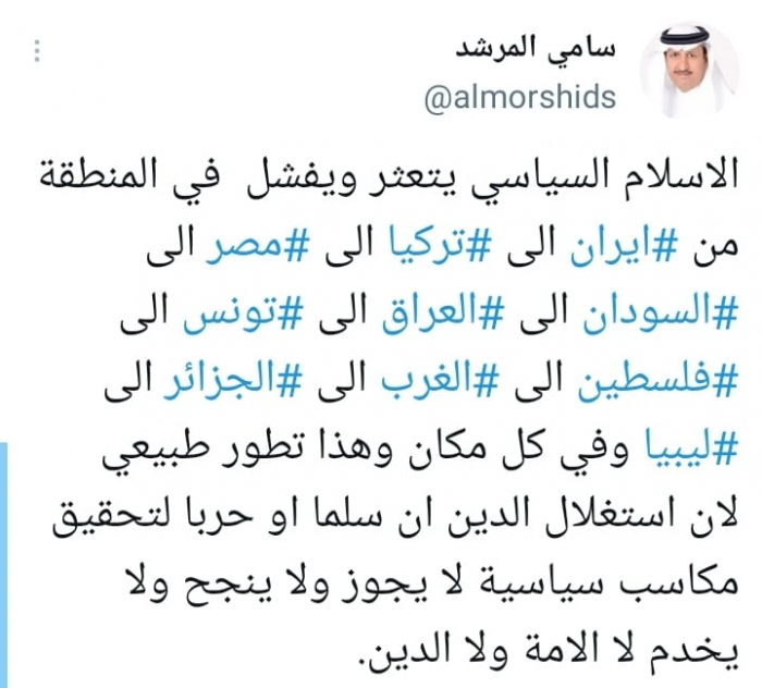 وأشار في تغريدة على حسابه بموقع التدوين المصغر تويتر، اليوم إلى أن: "الإسلام السياسي يتعثر ويفشل في المنطقة من إيران إلى تركيا إلى مصر إلى السودان إلى العراق إلى تونس إلى فلسطين إلى المغرب إلى الجزائر إلى ليبيا وفي كل مكان".