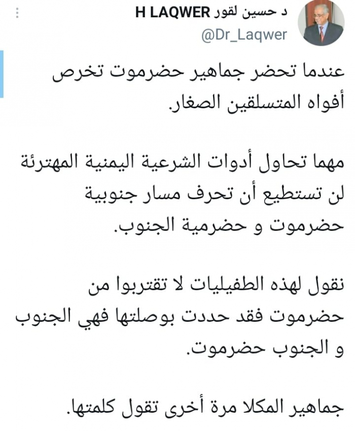 وقال في تغريدة على حسابه بموقع التدوين المصغر تويتر، اليوم إنه: "عندما تحضر جماهير حضرموت تخرص أفواه المتسلقين الصغار".