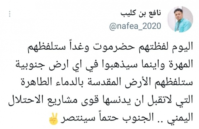 وشدد في تغريدة على حسابه بموقع التدوين المصغر تويتر، اليوم على أن: "اليوم لفظتهم حضرموت وغداً ستلفظهم المهرة وأينما سيذهبوا في أي أرض جنوبية ستلفظهم".