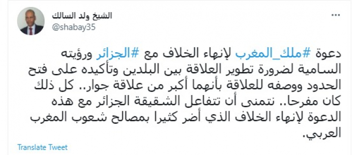 وقال في تغريدة عبر "تويتر" رصدها "المشهد العربي": "دعوة ملك المغرب لإنهاء الخلاف مع الجزائر ورؤيته السامية لضرورة تطوير العلاقة بين البلدين وتأكيده على فتح الحدود ووصفه للعلاقة بأنهما أكبر من علاقة جوار.. كل ذلك كان مفرحا".