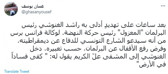 وقال في تغريدة عبر "تويتر" رصدها "المشهد العربي": "بعد ساعات على تهديدٍ أدلى به راشد الغنوشي رئيس البرلمان المعزول رئيس حركة النهضة، لوكالة فرانس برس من أنه سيدعو الشارع التونسي للدفاع عن ديمقراطيته، وفرض رفع الأقفال عن البرلمان، حسب تعبيره، دخل الغنوشي إلى المشفى علّ الكريم يقول له: كفى فساداً في الأرض".