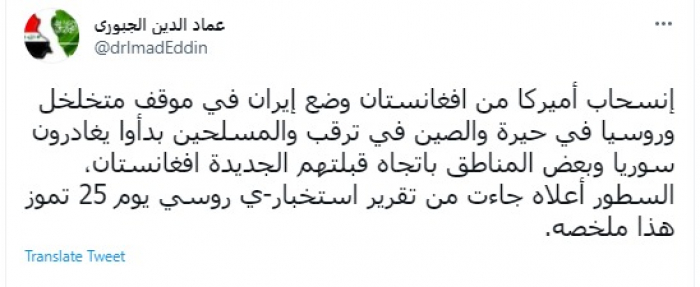 وقال في تغريدة عبر "تويتر" رصدها "المشهد العربي": "انسحاب أمريكا من أفغانستان وضع إيران في موقف متخلخل وروسيا في حيرة والصين في ترقب والمسلحين بدأوا يغادرون سوريا وبعض المناطق باتجاه قبلتهم الجديدة أفغانستان، السطور أعلاه جاءت من تقرير استخبار-ي روسي يوم 25 تموز هذا ملخصه".