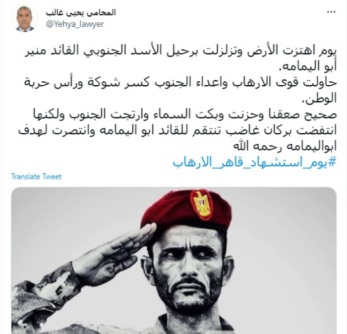 وقال في تغريدة عبر "تويتر" رصدها "المشهد العربي": "يوم اهتزت الأرض وتزلزلت برحيل الأسد الجنوبي القائد منير أبو اليمامة. حاولت قوى الإرهاب وأعداء الجنوب كسر شوكة ورأس حربة الوطن".