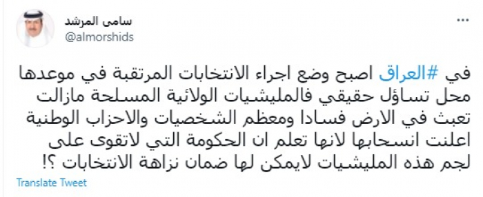 وتابع: "فالمليشيات الولائية المسلحة ما زالت تعبث في الأرض فسادًا ومعظم الشخصيات والأحزاب الوطنية أعلنت انسحابها لأنها تعلم أن الحكومة التي لا تقوى على لجم هذه المليشيات لايمكن لها ضمان نزاهة الانتخابات".