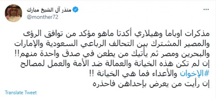 وقال في تغريدة عبر "تويتر" رصدها "المشهد العربي": "مذكرات أوباما وهيلاري أكدتا ما هو مؤكد من توافق الرؤى والمصير المشترك بين التحالف الرباعي السعودية والإمارات والبحرين ومصر ثم يأتيك من يطعن في صدق واحدة منهم".