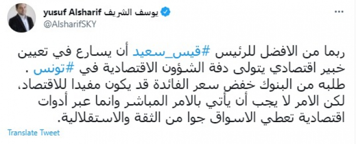 وقال في تغريدة عبر "تويتر" رصدها "المشهد العربي": "ربما من الأفضل للرئيس قيس سعيد أن يسارع في تعيين خبير اقتصادي يتولى دفة الشؤون الاقتصادية في تونس".