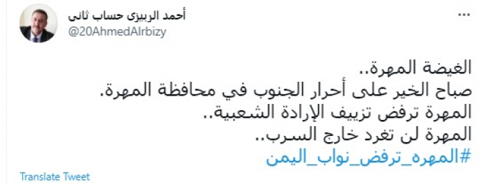 واختتم تغريدته بهاشتاج: "المهرة ترفض نواب اليمن".