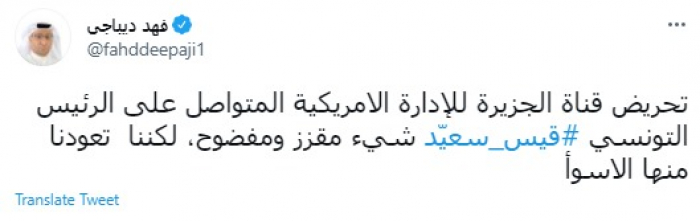 وقال في تغريدة عبر "تويتر" رصدها "المشهد العربي": "تحريض قناة الجزيرة للإدارة الأمريكية المتواصل على الرئيس التونسي قيس سعيّد شيء مقزز ومفضوح، لكننا تعودنا منها الأسوأ".