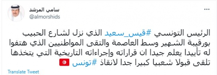 وقال في تغريدة عبر "تويتر" رصدها "المشهد العربي": "الرئيس التونسي قيس سعيد الذي نزل لشارع الحبيب بورقيبة الشهير وسط العاصمة والتقى المواطنيين الذي هتفوا له تأييدًا".