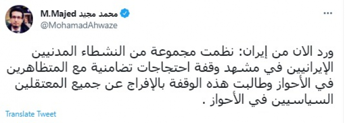 وقال في تغريدة عبر "تويتر" رصدها "المشهد العربي": "ورد الآن من إيران: نظمت مجموعة من النشطاء المدنيين الإيرانيين في مشهد وقفة احتجاجات تضامنية مع المتظاهرين في الأحواز وطالبت هذه الوقفة بالإفراج عن جميع المعتقلين السياسيين في الأحواز".