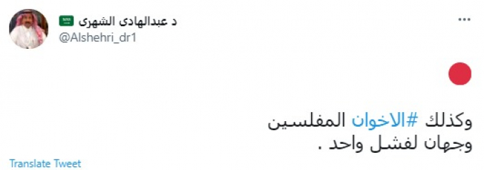وقال في تغريدة عبر "تويتر" رصدها "المشهد العربي": "وكذلك الإخوان المفلسين.. وجهان لفشل واحد".