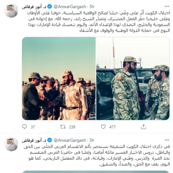 وكتب في تغريدات عبر "تويتر" رصدها "المشهد العربي": "في ذكرى احتلال الكويت الشقيقة نستحضر بألم الانقسام العربي الجلّي بين الحق والباطل، دروس الاختبار العسير ماثلة أمامنا، ولعلنا في حاضرنا العربي المنقسم نجد العبرة والدرس. وطني الإمارات، وقيادته، في ذاك المفصل التاريخي، كما هو اليوم، يقف مع الحق، والمبدأ، والشقيق".