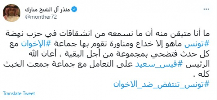 وقال في تغريدة عبر "تويتر" رصدها "المشهد العربي": "ما أنا متيقن منه أن ما نسمعه من انشقاقات في حزب نهضة تونس ماهو إلا خداع ومناورة تقوم بها جماعة الإخوان مع كل حدث فتضحي بمجموعة من أجل البقية، أعان الله الرئيس قيس سعيد على التعامل مع جماعة جمعت الخبث كله".