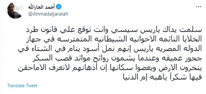 وقال في تغريدة عبر "تويتر" رصدها "المشهد العربي": "سلمت يداك ياريس سيسي وأنت توقع على قانون طرد الخلايا النائمة الإخوانية الشيطانية المتمترسة في جهاز الدولة المصرية".