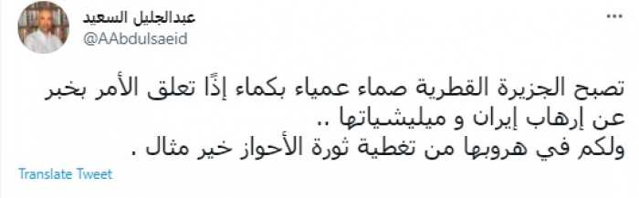 وقال في تغريدة عبر "تويتر" رصدها "المشهد العربي": "تصبح الجزيرة القطرية صماء عمياء بكماء إذًا تعلق الأمر بخبر عن إرهاب إيران ومليشياتها.. ولكم في هروبها من تغطية ثورة الأحواز خير مثال".