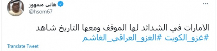 واختتم تغريدته بهاشتاج: "غزو الكويت.. الغزو العراقي الغاشم".