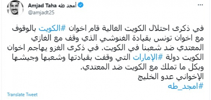 وكتب في تغريدة عبر "تويتر" رصدها "المشهد العربي": "في ذكرى احتلال الكويت الغالية قام إخوان الكويت بالوقوف مع إخوان تونس بقيادة الغنوشي الذي وقف مع الغازي المعتدي ضد شعبنا في الكويت".