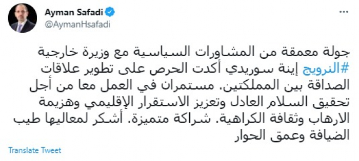 الصفدي: نحرص على تطوير العلاقات مع النرويج