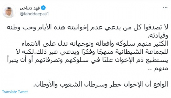 وقال في تغريدة عبر "تويتر" رصدها "المشهد العربي": "لا تصدقوا كل من يدعي عدم إخوانيته هذه الأيام وحب وطنه وقيادته".