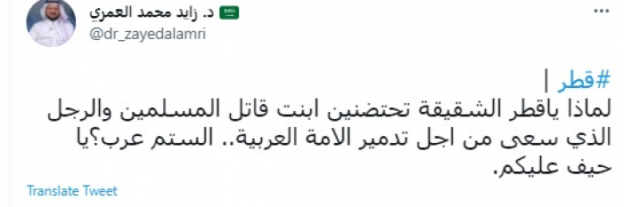 وقال في تغريدة عبر "تويتر" رصدها "المشهد العربي": "لماذا يا قطر الشقيقة تحتضنين ابنة قاتل المسلمين والرجل الذي سعى من أجل تدمير الأمة العربية.. الستم عرب؟يا حيف عليكم".