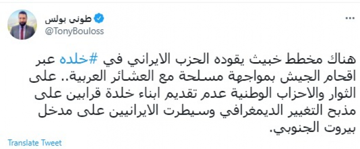 كشف الكاتب الصحفي اللبناني طوني بولس، اليوم الاثنين، عن تفاصيل مخطط حزب الله في مدينة خلدة، عبر إقحام الجيش اللبناني في مواجهة مسلحة مع العشائر العربية.