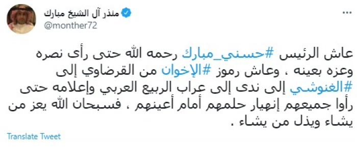 وكتب في تغريدة عبر "تويتر" رصدها "المشهد العربي": "عاش الرئيس حسني مبارك رحمه الله حتى رأى نصره وعزه بعينه".