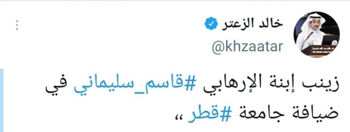 استنكر المحلل السياسي السعودي خالد الزعتر، استضافة جامعة قطرية لابنة الإرهابي الإيراني قاسم سليماني، القائد السابق لفيلق قدس الإيراني.