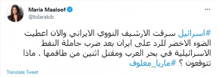 وكتبت في تغريدة عبر "تويتر" رصدها "المشهد العربي": "إسرائيل سرقت الأرشيف النووي الإيراني والآن أعطيت الضوء الأخضر للرد على إيران بعد ضرب حاملة النفط الإسرائيلية في بحر العرب ومقتل اثنين من طاقمها . ماذا تتوقعون؟".