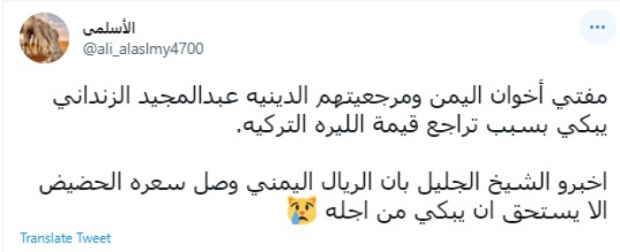 وقال في تغريدة عبر "تويتر" رصدها "المشهد العربي": "مفتي إخوان اليمن ومرجعيتهم الدينية عبدالمجيد الزنداني يبكي بسبب تراجع قيمة الليرة التركية".