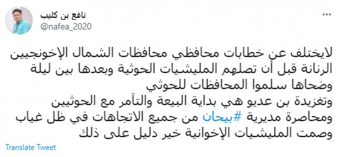 وأضاف: "وتغريدة بن عديو هي بداية البيعة والتآمر مع الحوثيين ومحاصرة مديرية بيحان من جميع الاتجاهات في ظل غياب وصمت المليشيات الإخوانية خير دليل على ذلك".