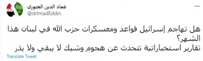 وقال في تغريدة عبر "تويتر" رصدها "المشهد العربي": "هل تهاجم إسرائيل قواعد ومعسكرات حزب الله في لبنان هذا الشهر؟.. تقارير استخباراتية تتحدث عن هجوم وشيك لا يبقي ولا يذر".