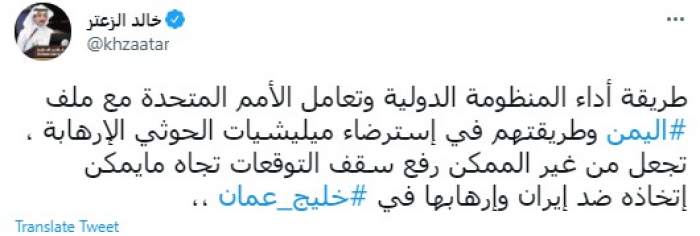 وقال في تغريدة عبر "تويتر" رصدها "المشهد العربي": "طريقة أداء المنظومة الدولية وتعامل الأمم المتحدة مع ملف اليمن وطريقتهم في استرضاء مليشيات الحوثي الإرهابية تجعل من غير الممكن رفع سقف التوقعات تجاه ما يمكن إتخاذه ضد إيران وإرهابها في خليج عمان".
