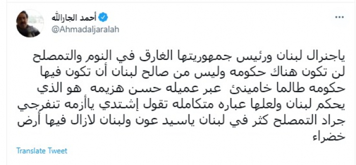 وقال في تغريدة عبر "تويتر" رصدها "المشهد العربي": "يا جنرال لبنان ورئيس جمهوريتها الغارق في النوم والتمصلح لن تكون هناك حكومة وليس من صالح لبنان أن تكون فيها حكومة طالما خامنئي عبر عميله حسن هزيمة هو الذي يحكم لبنان".