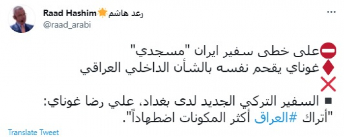 وقال في تغريدة عبر "تويتر" رصدها "المشهد العربي": "على خطى سفير ايران مسجدي غوناي يقحم نفسه بالشأن الداخلي العراقي.. السفير التركي الجديد لدى بغداد، علي رضا غوناي: أتراك العراق أكثر المكونات اضطهادًا".