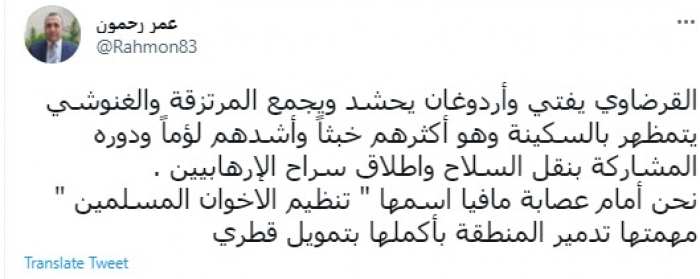 وقال في تغريدة عبر "تويتر" رصدها "المشهد العربي": "القرضاوي يفتي وأردوغان يحشد ويجمع المرتزقة والغنوشي يتمظهر بالسكينة وهو أكثرهم خبثًا وأشدهم لؤمًا ودوره المشاركة بنقل السلاح وإطلاق سراح الإرهابيين".