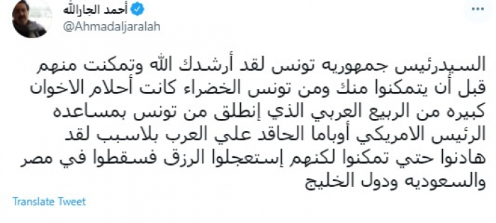 وقال في تغريدة عبر "تويتر" رصدها "المشهد العربي": "السيد رئيس جمهورية تونس لقد أرشدك الله وتمكنت منهم قبل أن يتمكنوا منك ومن تونس الخضراء كانت أحلام الإخوان كبيرة من الربيع العربي الذي انطلق من تونس بمساعدة الرئيس الأمريكي أوباما الحاقد على العرب بلا سبب".