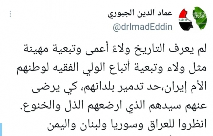 استنكر المحلل السياسي عمادالدين الجبوري، التبعية الذليلة والولاء الأعمى لداعمي نظام ملالي طهران.