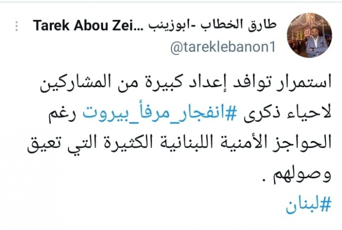 وشدد في تغريدة على حسابه بموقع التدوين المصغر تويتر، اليوم على: "استمرار توافد أعداد كبيرة من المشاركين لإحياء ذكرى انفجار مرفأ بيروت رغم الحواجز الأمنية اللبنانية الكثيرة التي تعيق وصولهم"، مختتما بهاشتاج: "لبنان".