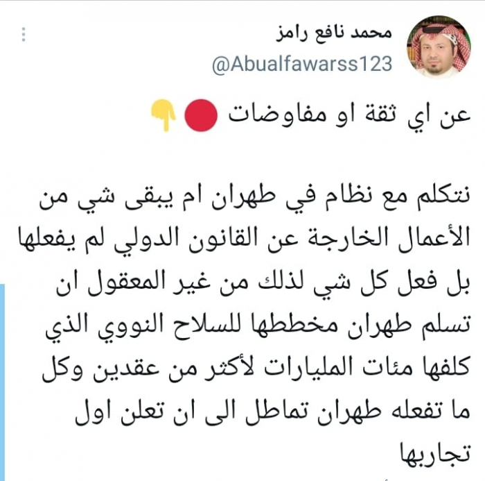 وقال في تغريدة على حسابه بموقع التدوين المصغر تويتر، اليوم: "عن أي ثقة أو مفاوضات نتكلم مع نظام في طهران لم يبقى شي من الأعمال الخارجة عن القانون الدولي لم يفعلها".