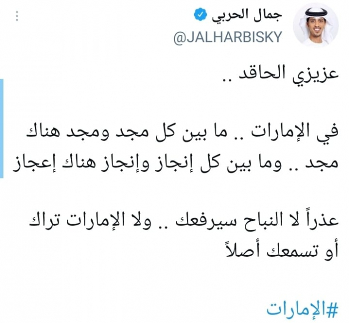 وقال في تغريدة على حسابه بموقع التدوين المصغر تويتر، اليوم: "عزيزي الحاقد.. في الإمارات.. ما بين كل مجد ومجد هناك مجد.. وما بين كل إنجاز وإنجاز هناك إعجاز".