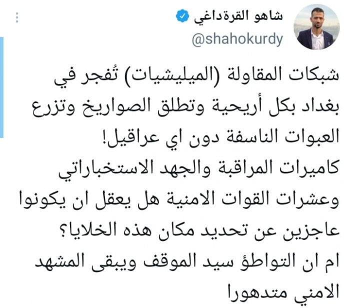 ألمح الكاتب الصحفي العراقي شاهو قرة داغي، إلى تواطؤ السلطة مع المليشيات الموالية لإيران، مستنكرا زرعها المتفجرات ونشر الصواريخ، بينما تفشل السلطة في تتبعهم.