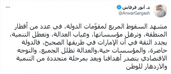 وقال في تغريدة على تويتر، اليوم الخميس إن: "مشهد السقوط المريع لمقوّمات الدولة، في عدد من أقطار المنطقة، وترهل مؤسساتها، وغياب العدالة، وتعطل التنمية، يجدد الثقة في أن الإمارات في طريقها الصحيح".
