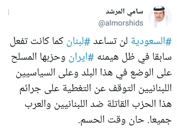 استبعد المحلل السياسي السعودي سامي المرشد، قبول المملكة العربية السعودية بمساعدة لبنان بالوتيرة السابقة، طالما استمر تحت هيمنة مليشيات حزب الله الموالية لإيران.