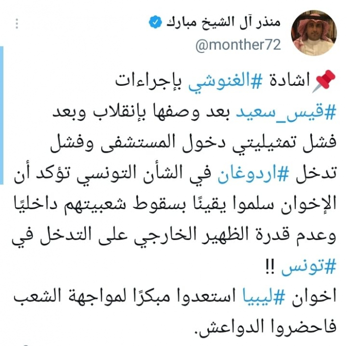وأشار في تغريدة على حسابه بموقع التدوين المصغر تويتر، اليوم إلى أن: "إشادة الغنوشي بإجراءات قيس سعيد بعد وصفها بانقلاب وبعد فشل تمثيليتي دخول المستشفى وفشل تدخل أردوغان في الشأن التونسي تؤكد أن الإخوان سلموا يقينًا بسقوط شعبيتهم داخليًا وعدم قدرة الظهير الخارجي على التدخل في تونس".