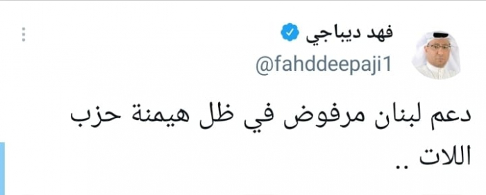 وشدد في تغريدة على حسابه بموقع التدوين المصغر تويتر، اليوم على أن: "دعم لبنان مرفوض في ظل هيمنة حزب اللات".