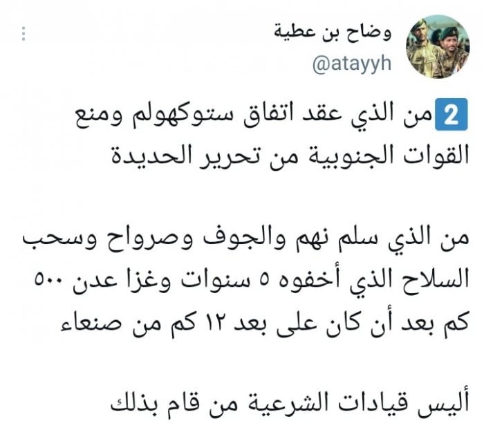 وتساءل في تغريدة على حسابه بموقع التدوين المصغر تويتر اليوم: "من الذي عقد اتفاق ستوكهولم ومنع القوات الجنوبية من تحرير الحديدة؟".